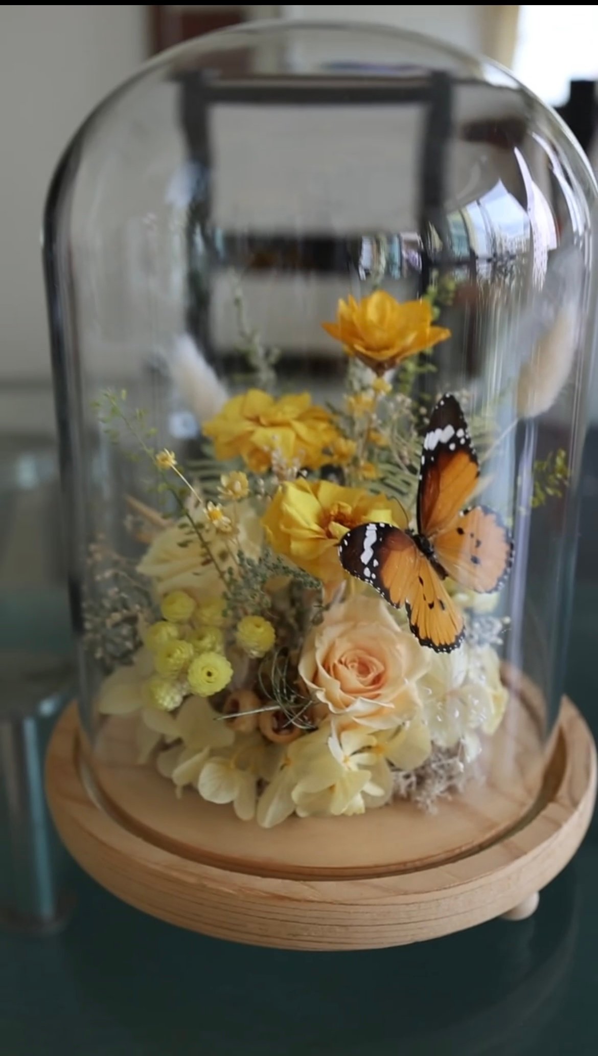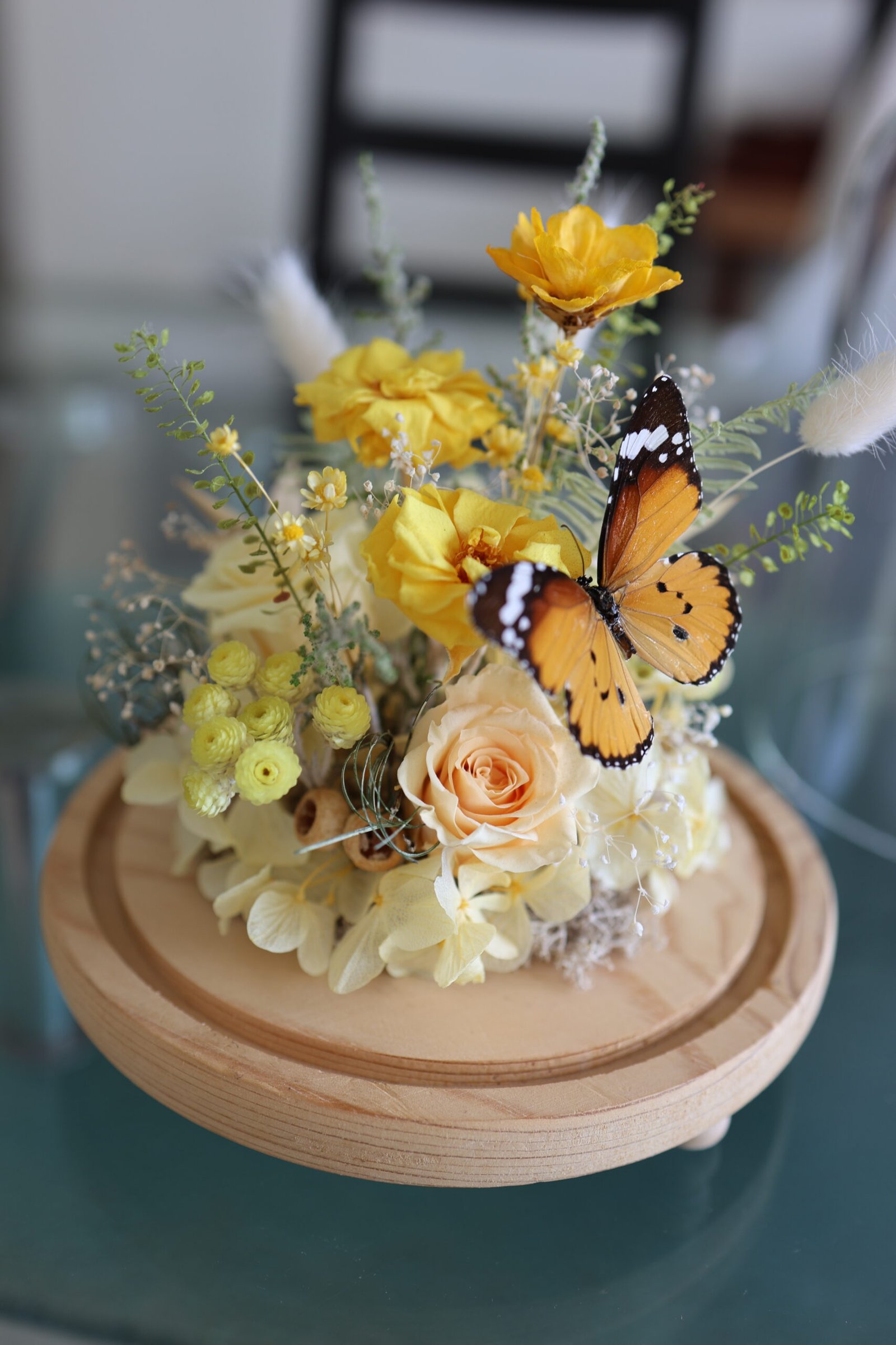 “Elegant preserved flower arrangement in a glass dome with a wooden base. Features a real beautiful mix of yellow and cream flowers accompanied by a delicate butterfly decoration.