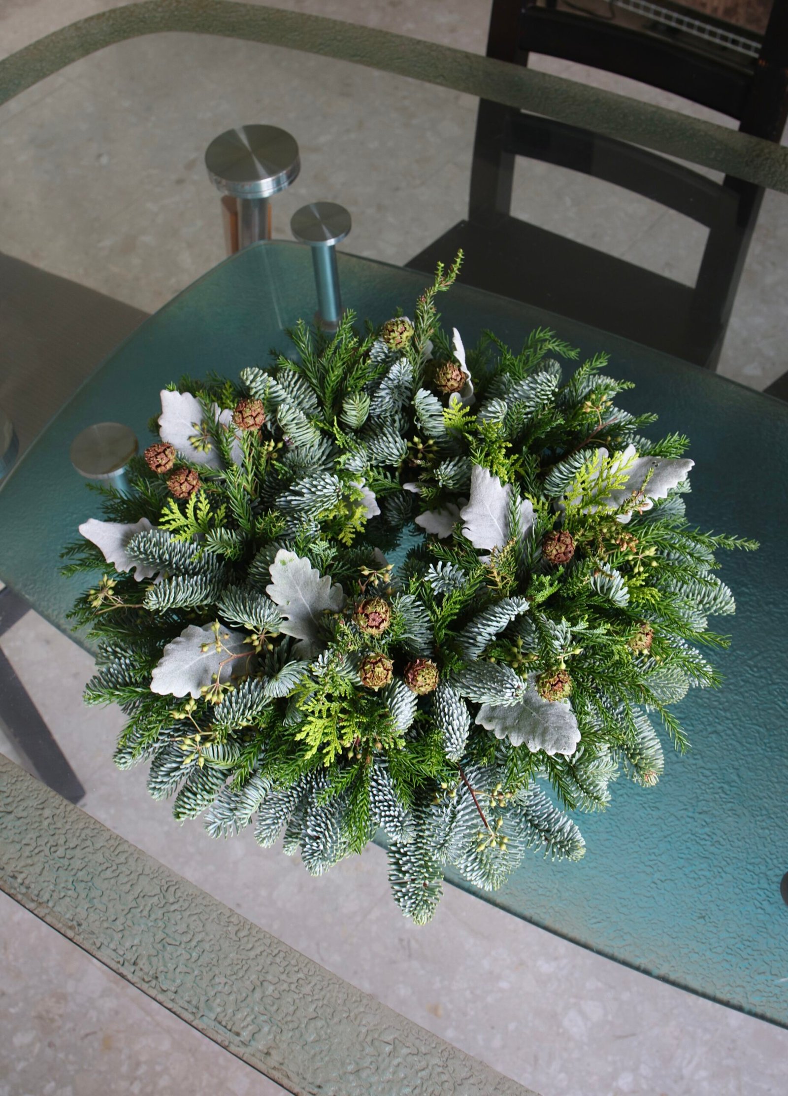A festive arrangement features a mix of fresh Christmas greeneries like evergreen branches, fir, and holly leaves inserted into floral foam that help make them last.