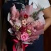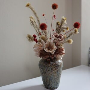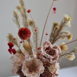 Elevate your space with this stunning dried and preserved flower arrangement in a unique, handcrafted vase. The bouquet features a harmonious blend of muted tones – creams, and earthy browns – with pops of rich red accents. Preserved and dried blooms including hydrangeas, and whimsical textures create a captivating display.
