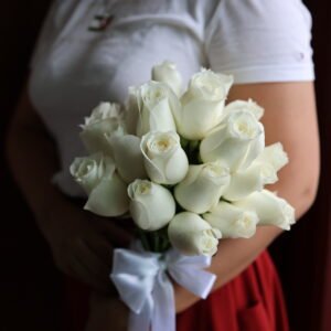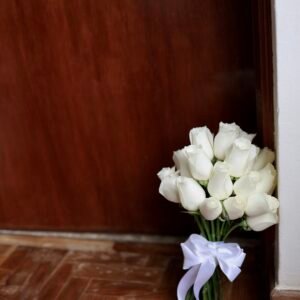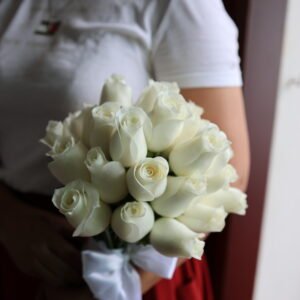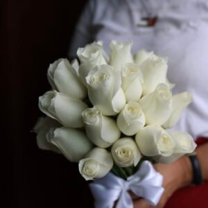A timeless classic, this stunning bouquet features a dozen pristine white roses tied with a delicate white ribbon. Perfect for the modern bride seeking sophistication and romance. Handcrafted with love, ideal for wedding ceremonies in Singapore’s lush gardens or intimate settings. Fresh flowers guaranteed. Approximately 25-28 roses.