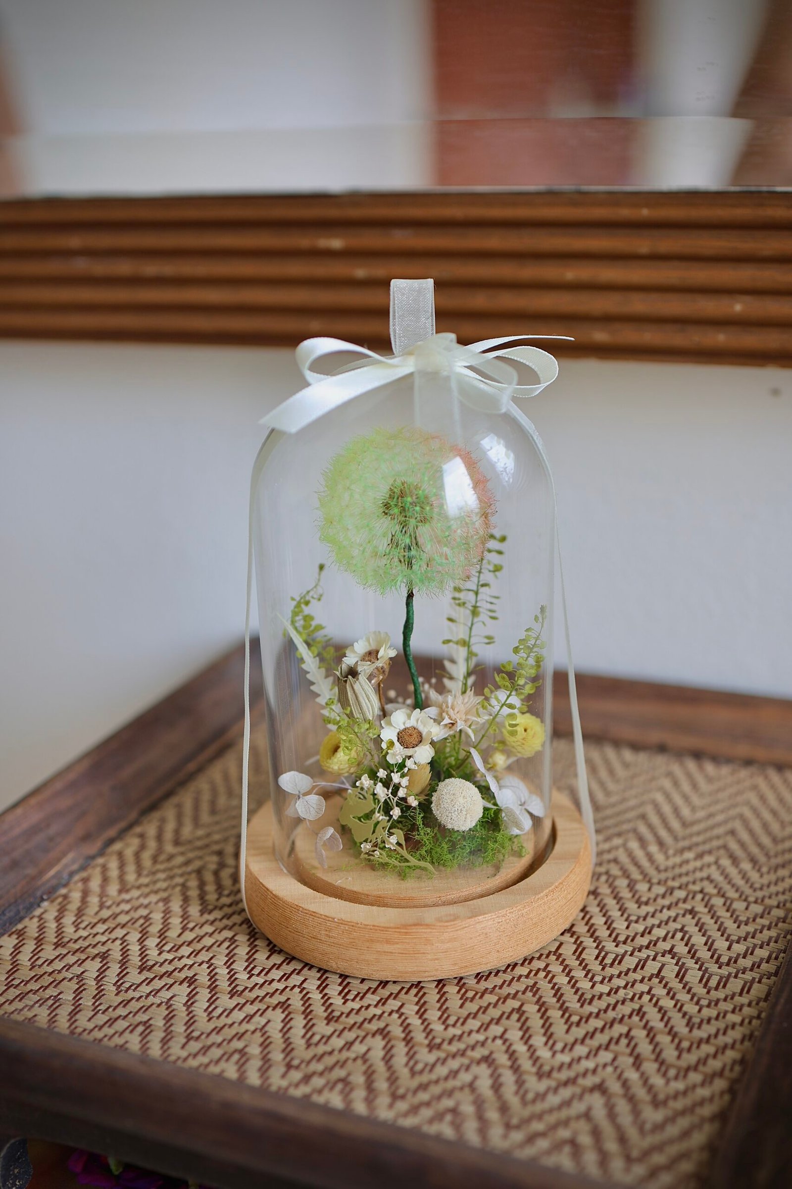 What’s inside: Preserved pastel green dandelion puff, mini daisies, white rice flowers, white pods, hydrangeas, moss, dried ferns