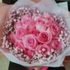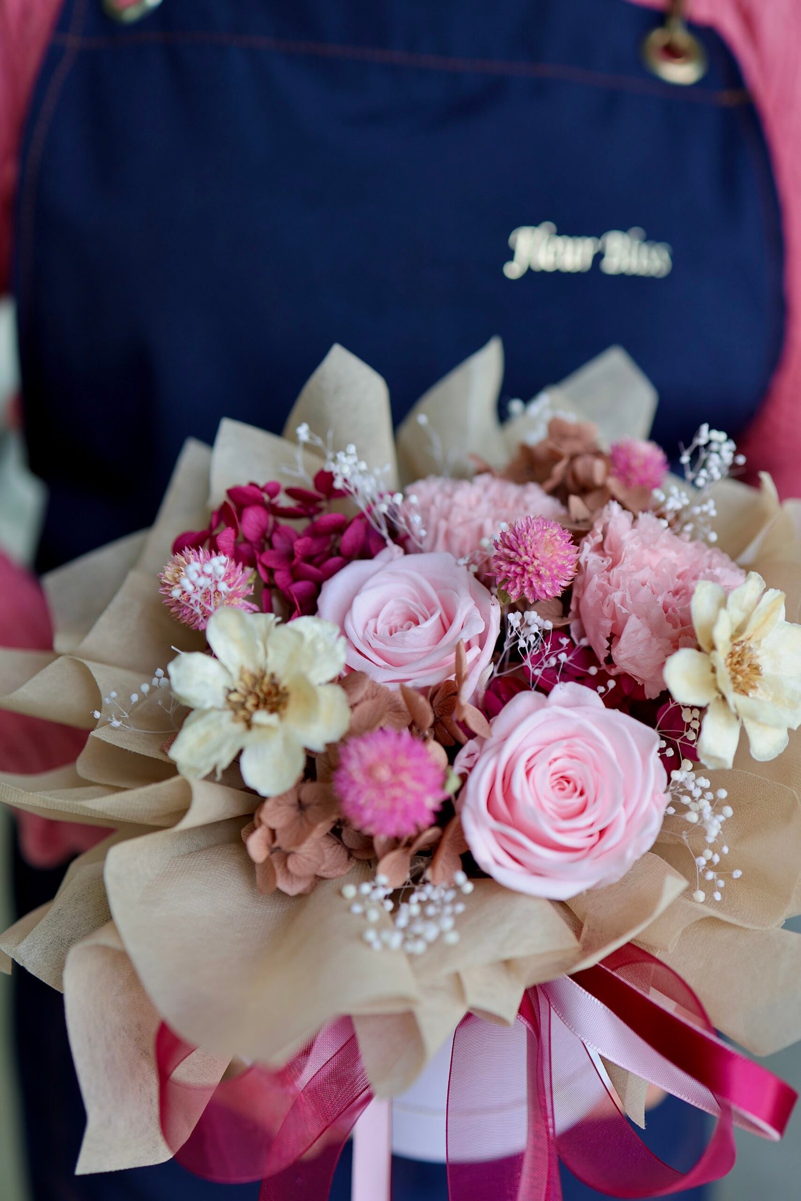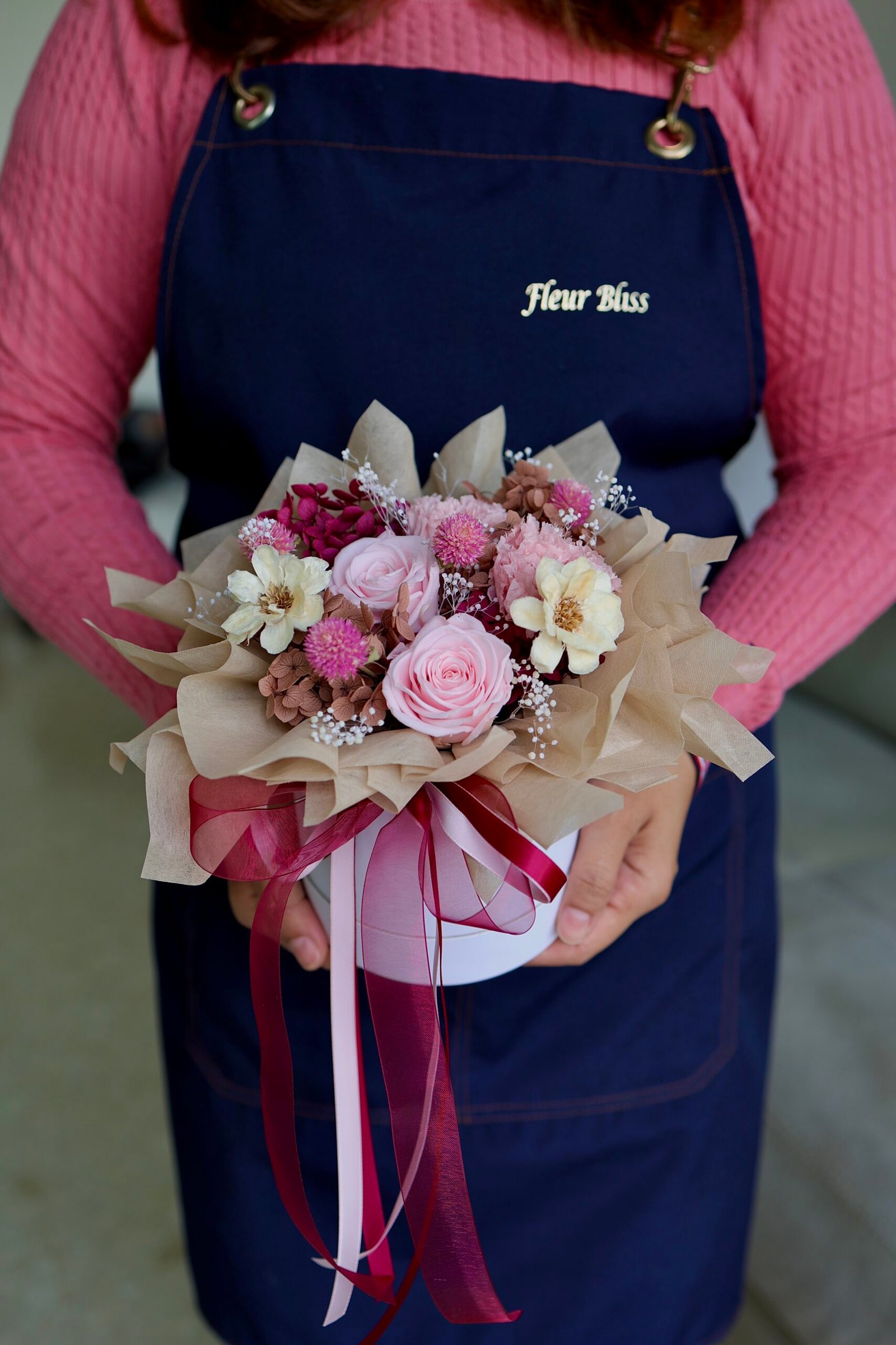 Wrapped in fiber non-woven burly wood and finished with cascading burgundy + blush satin ribbons. These real blooms are preserved to stay soft and beautiful for 1–2 years. No water, no maintenance — just a daily reminder that she’s loved.