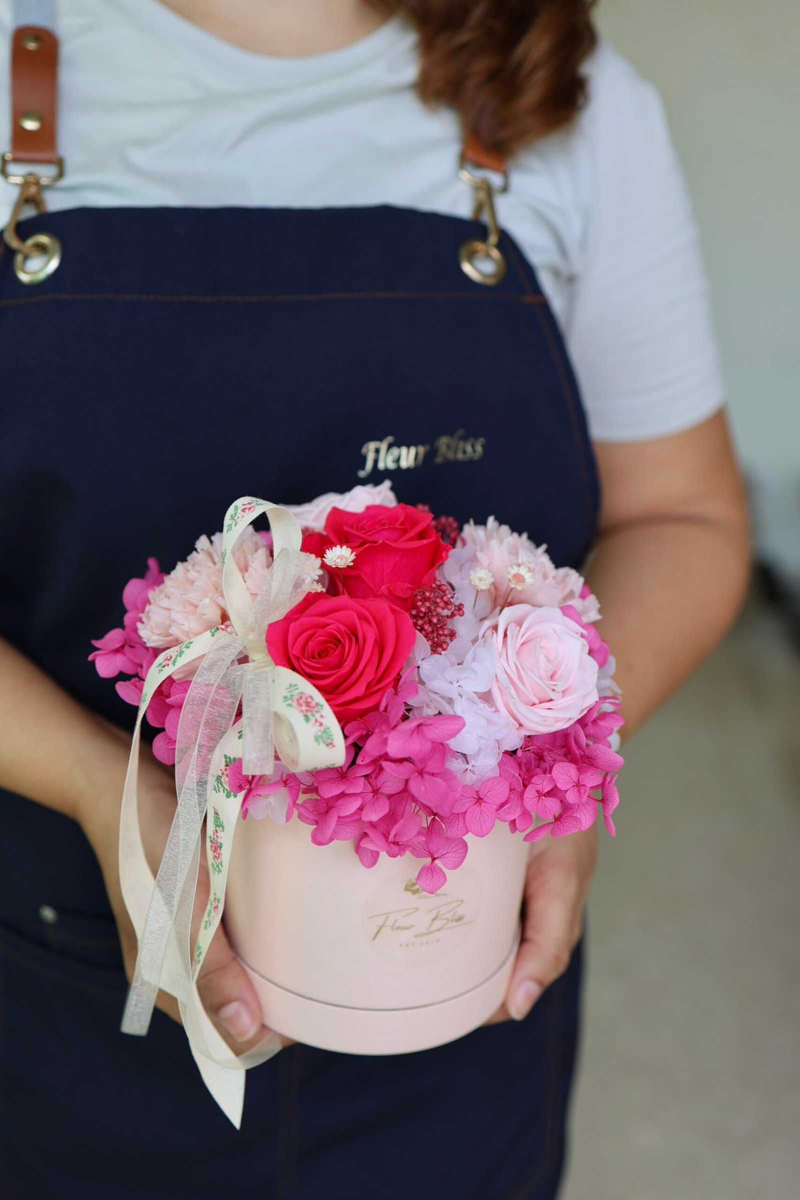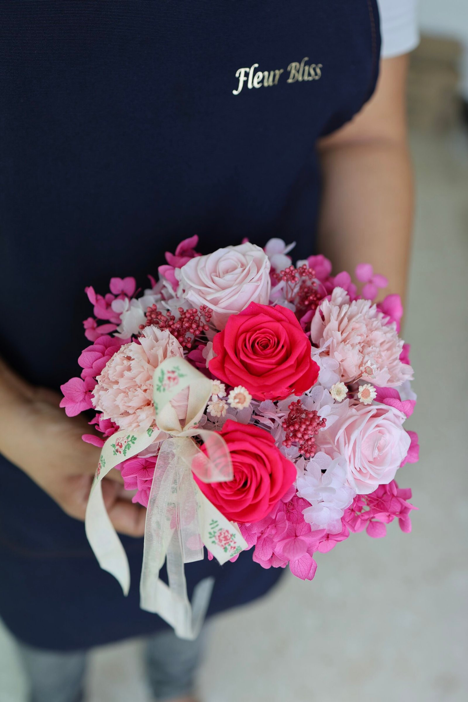 What’s inside: Preserved hot pink roses, blush rose, fuchsia hydrangeas, pink carnations, rice flowers