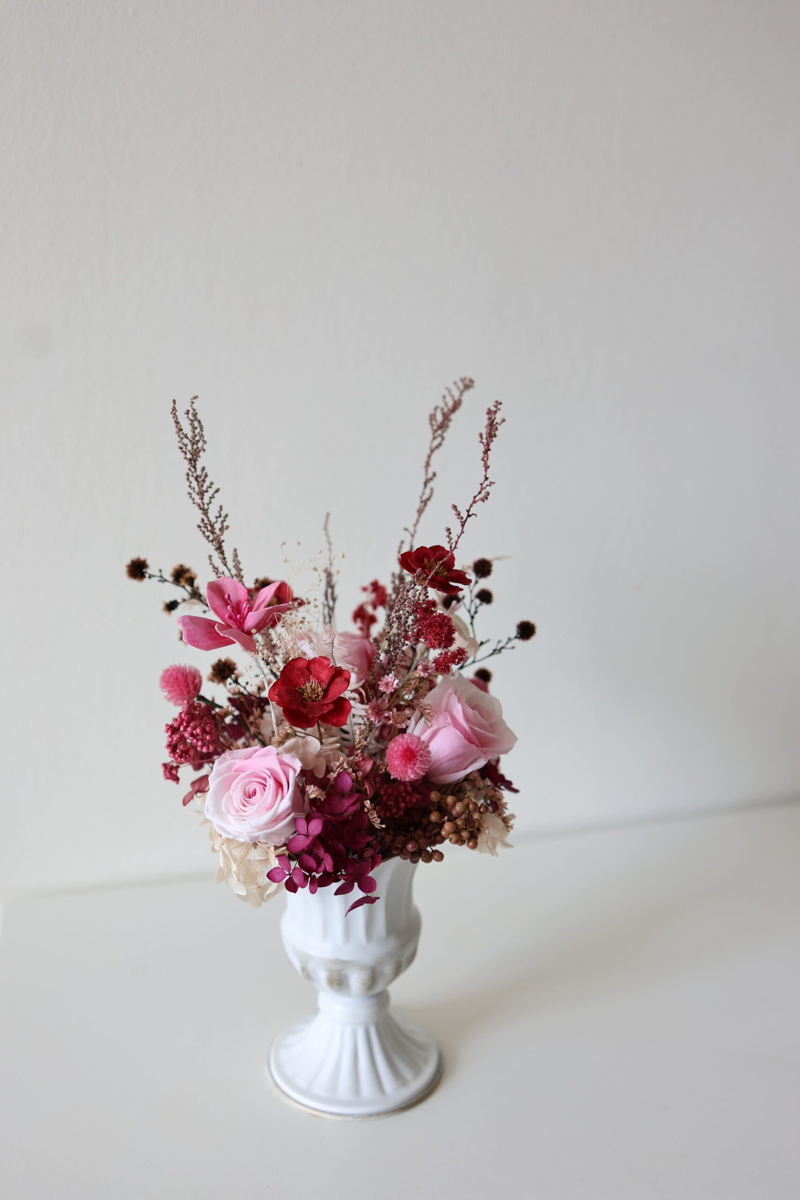 It’s not a bouquet — it’s a piece of décor. The urn makes it feel premium and permanent. The berry + blush palette is sophisticated, not cutesy. It says “I see your style, Mum” and gives her something she’ll display proudly for years.