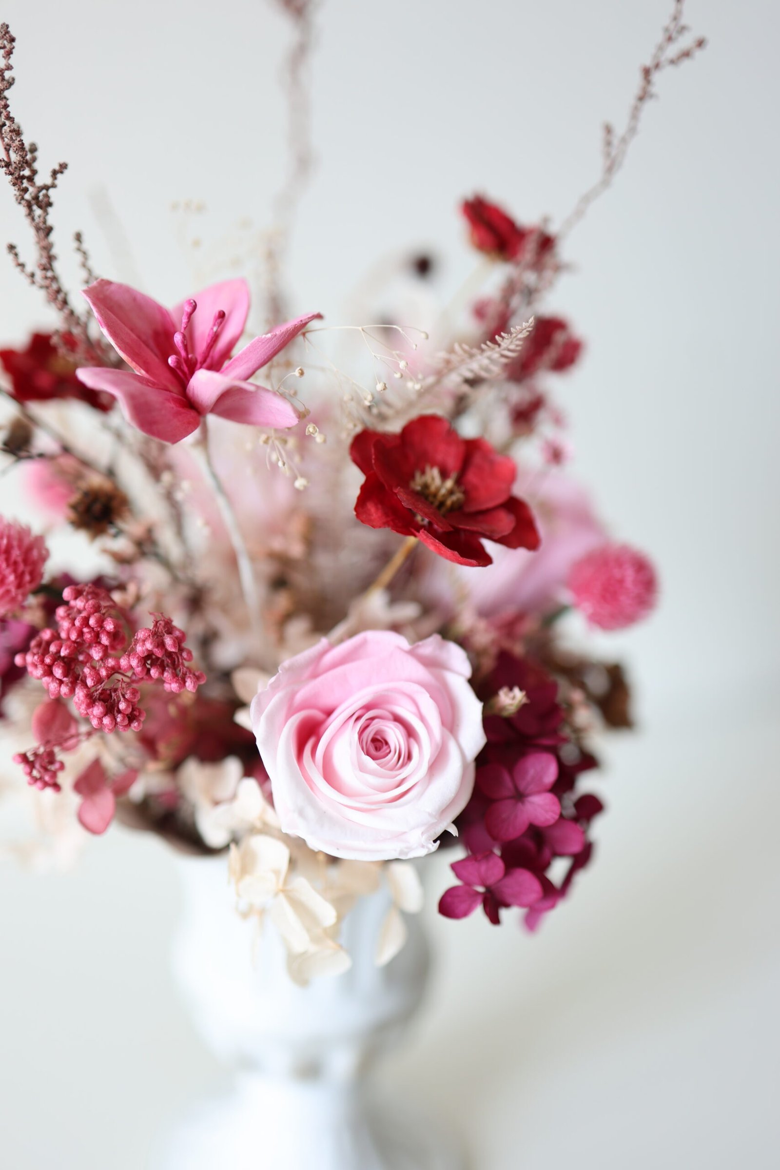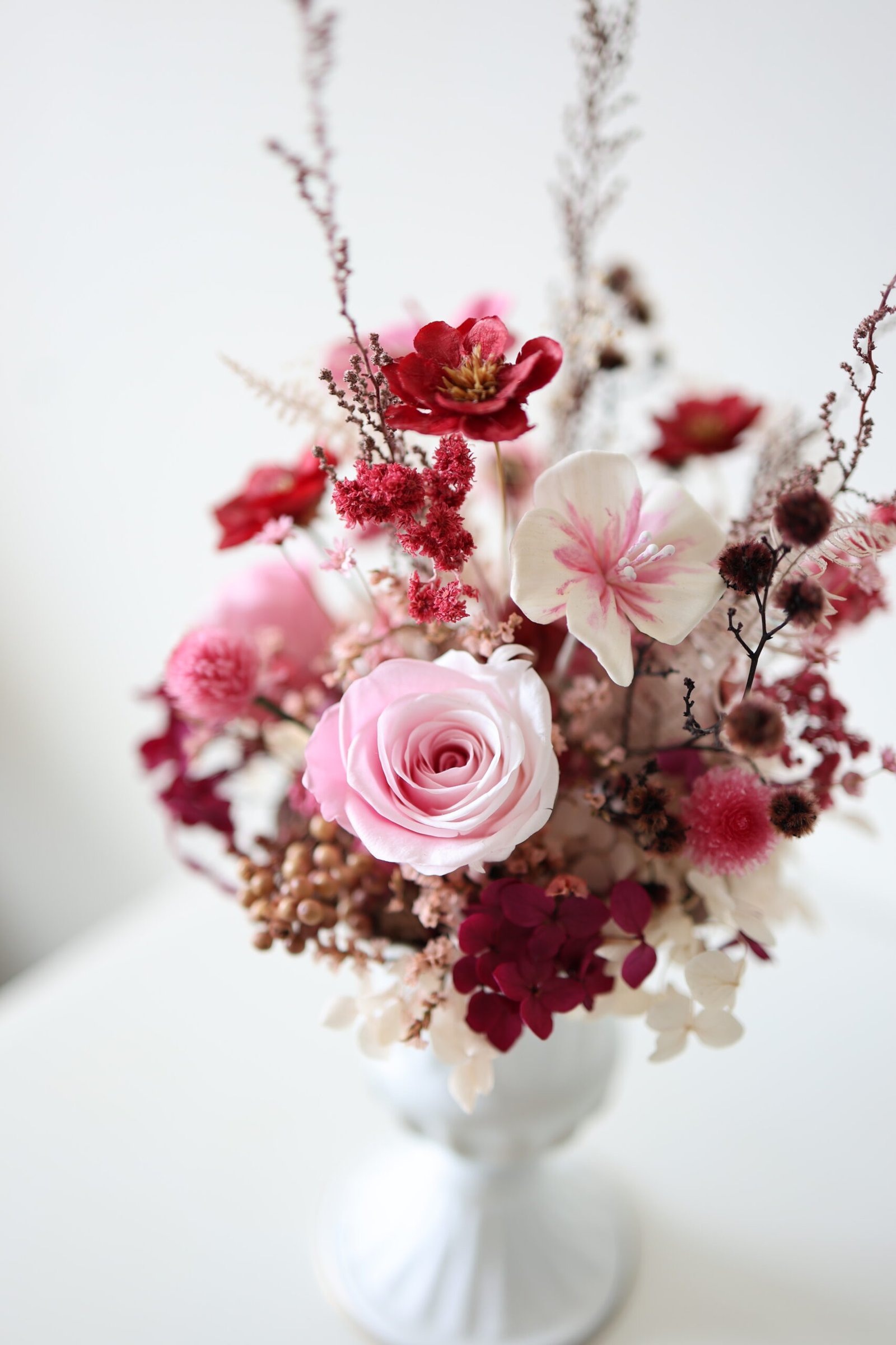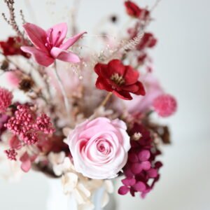 What’s inside: Preserved pink roses, crimson cosmos, mauve & cream hydrangeas, pink globe amaranth, brown pods, rice flowers, caspia, dried ferns