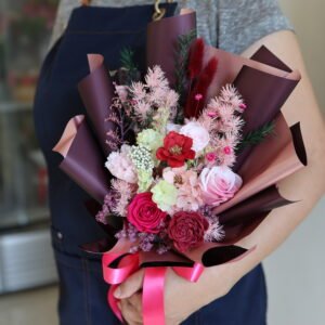 Handcrafted with love, this stunning bouquet features a mix of preserved roses, blooms, and foliage in soft pink, red, and mauve hues. Wrapped in chic paper with a delicate pink ribbon tie. Perfect for gifting or adding a touch of timeless beauty to any space! 🌸✨