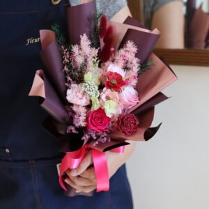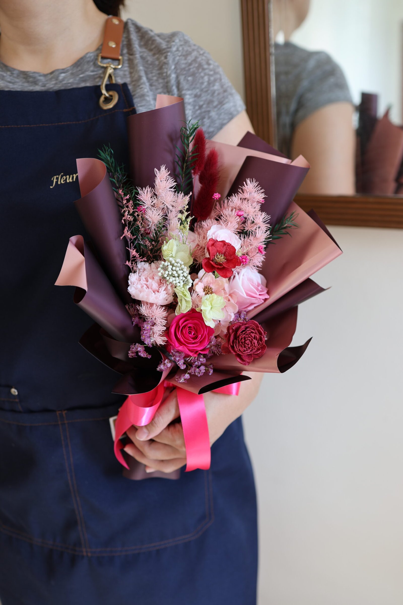 Handcrafted with love, this stunning bouquet features a mix of preserved roses, blooms, and foliage in soft pink, red, and mauve hues. Wrapped in chic paper with a delicate pink ribbon tie. Perfect for gifting or adding a touch of timeless beauty to any space!