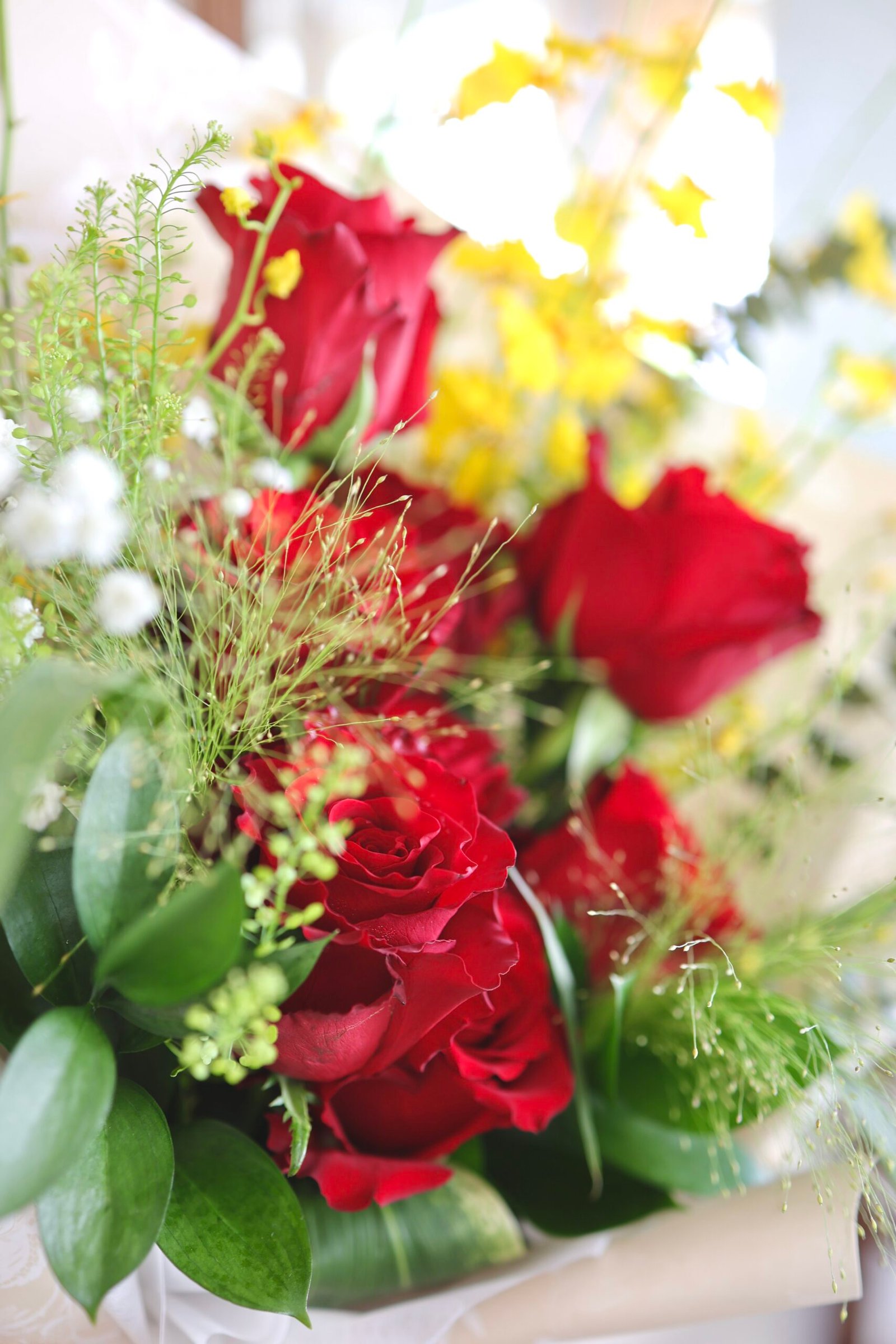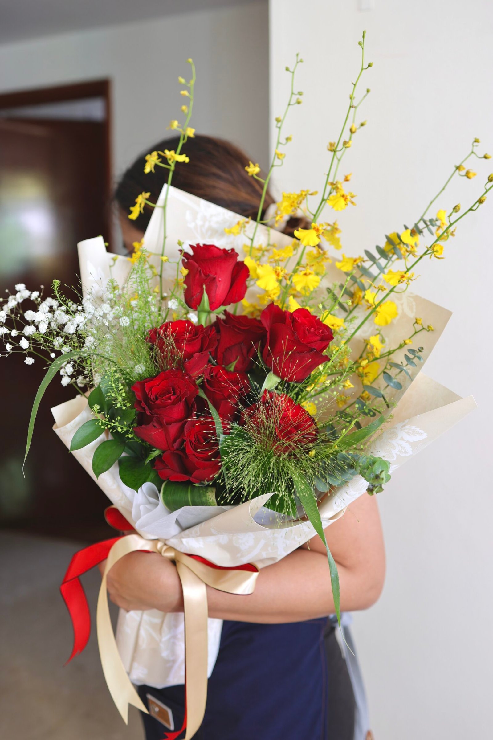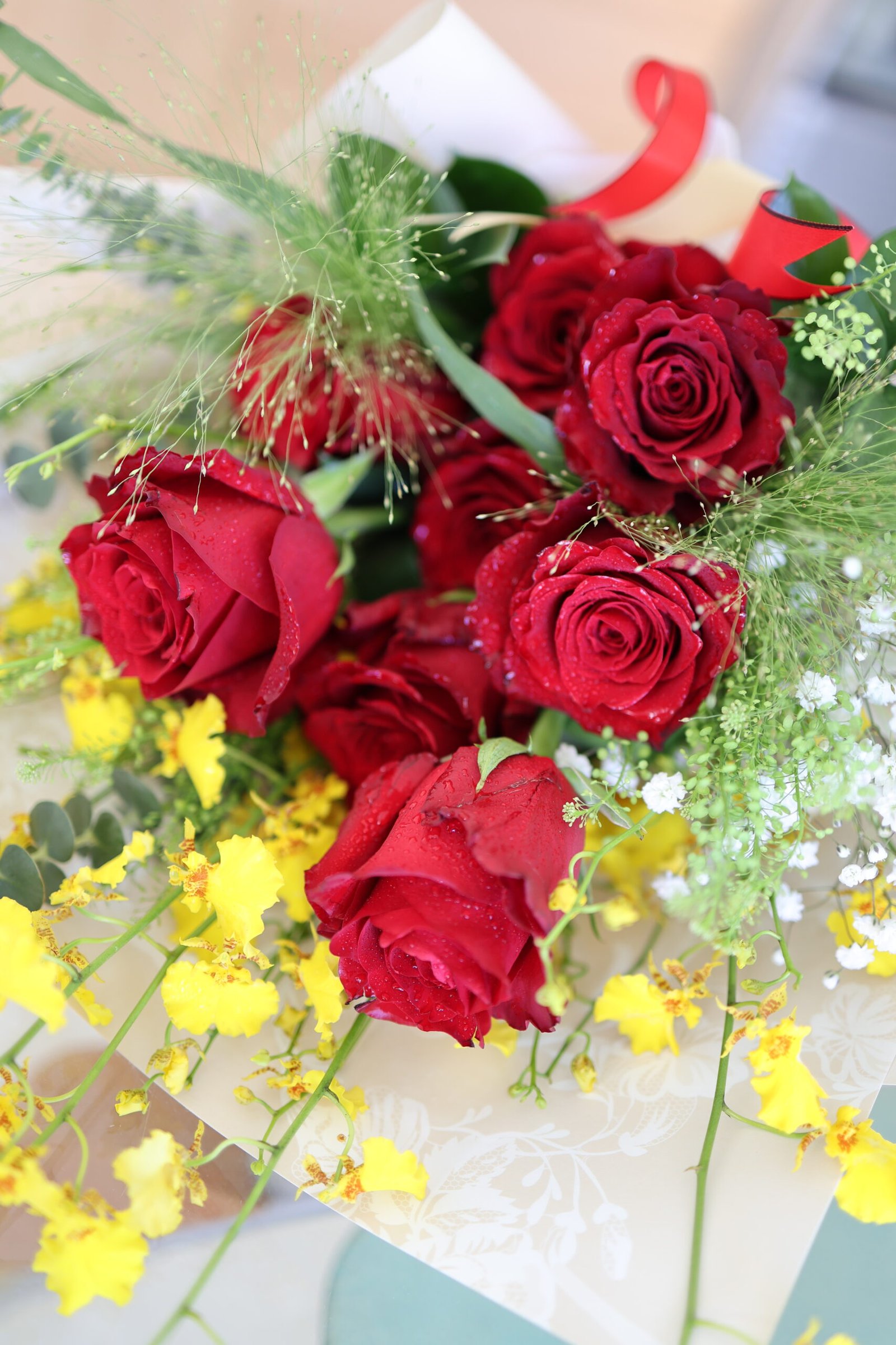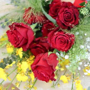 Elevate any moment with this gorgeous bouquet featuring vibrant red roses, delicate baby’s breath, and bright yellow accents. Wrapped in elegant paper with a striking red and gold ribbon.