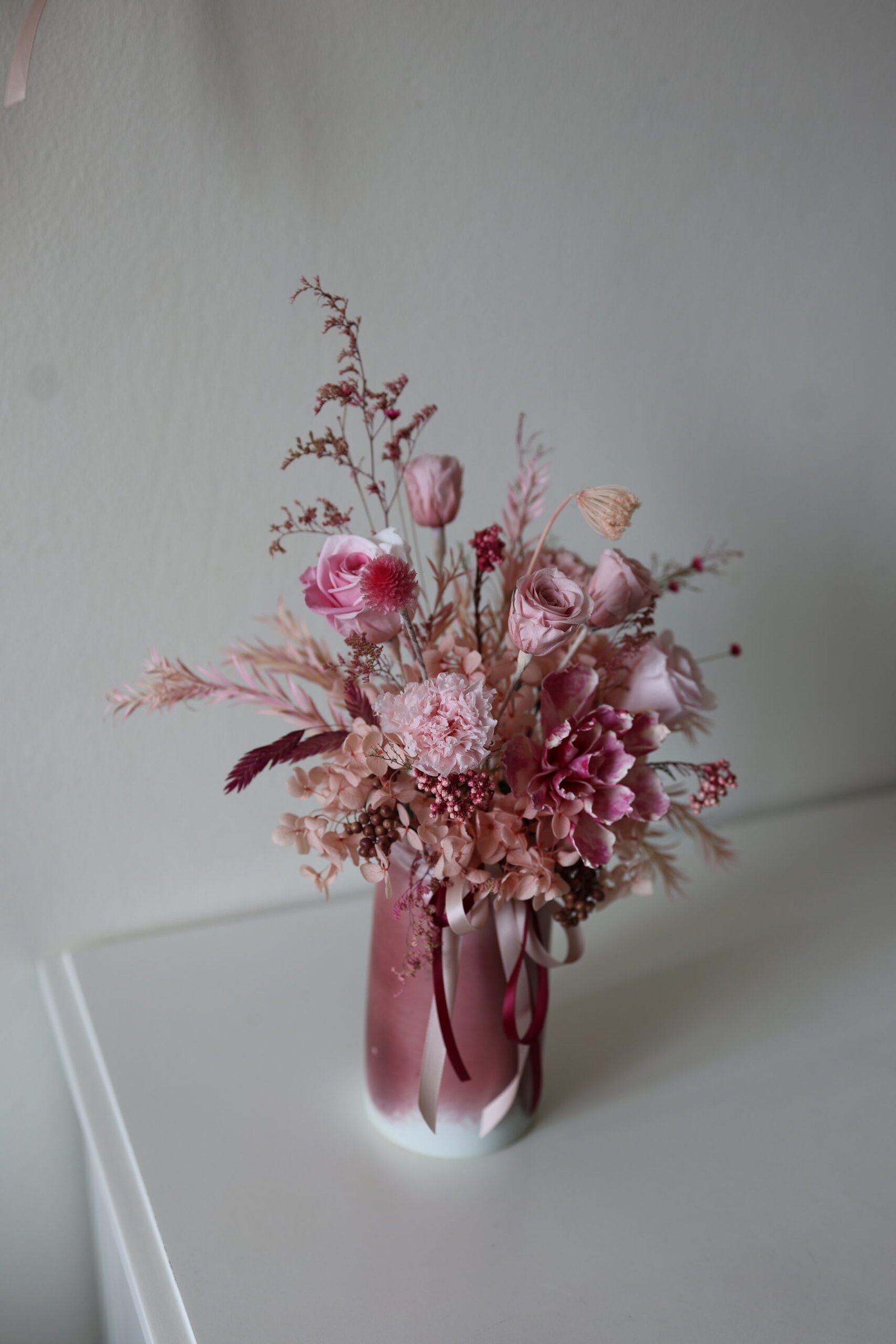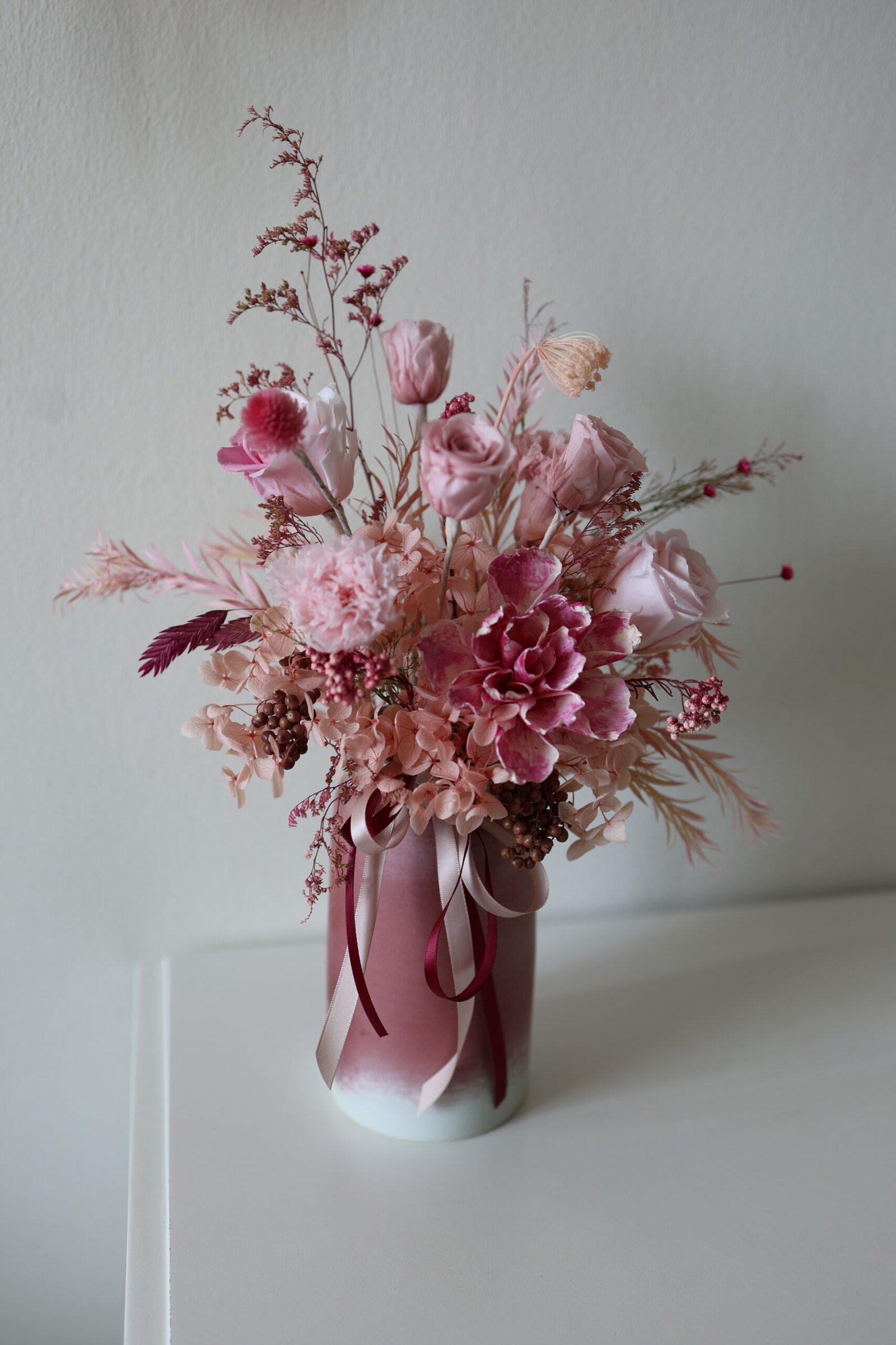 Elevate your décor with this enchanting arrangement of pink preserved roses, carnations, and textured filler flowers set in a stylish ombre pink ceramic vase. The vase features a smooth gradient from deep pink to white at the base, accented with elegant pink and burgundy ribbon bows. Ideal for gifts, wedding anniversary, or everyday chic styling.