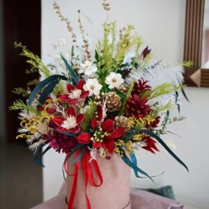 Bring the magic of Christmas to your home with our Festive Christmas Floral Arrangement. This stunning arrangement features a vibrant mix of preserved and dried red, white flowers, pinecones, and lush greenery, all beautifully presented in a stylish cylindrical box tied with a festive red ribbon. Perfect for adding a touch of holiday cheer to your decor or as a thoughtful gift for loved ones.