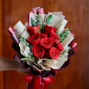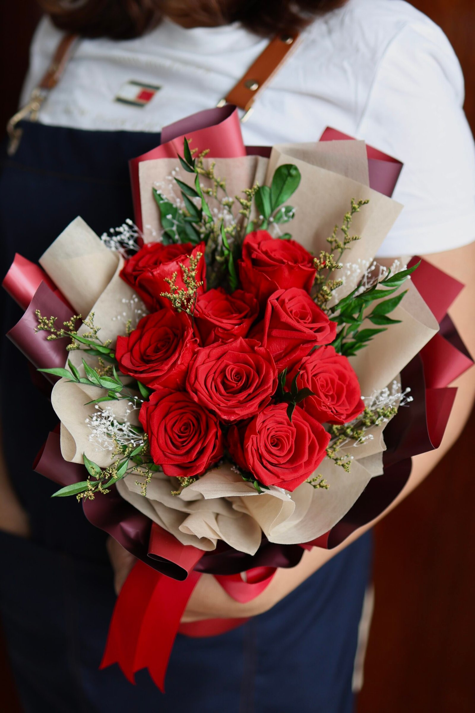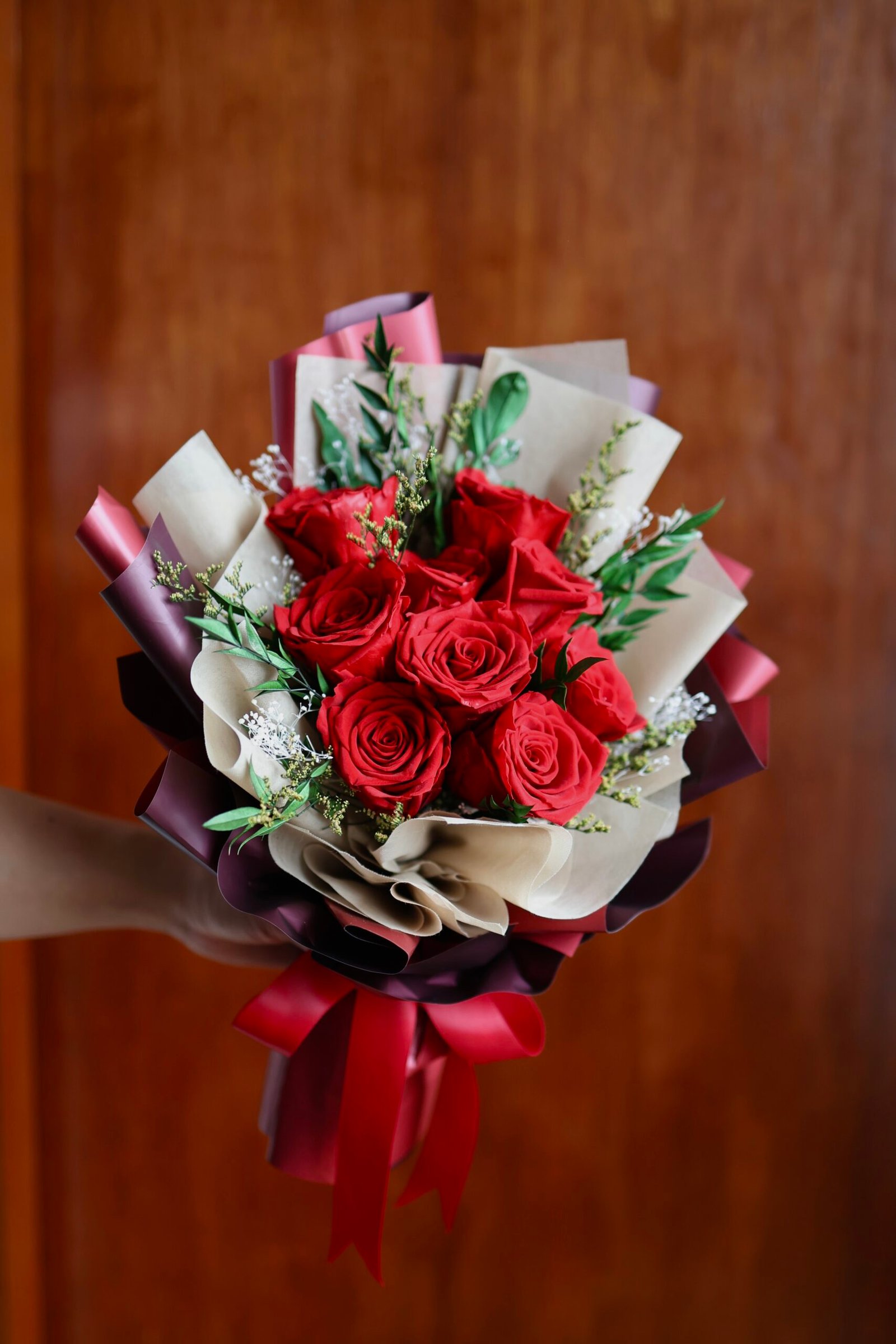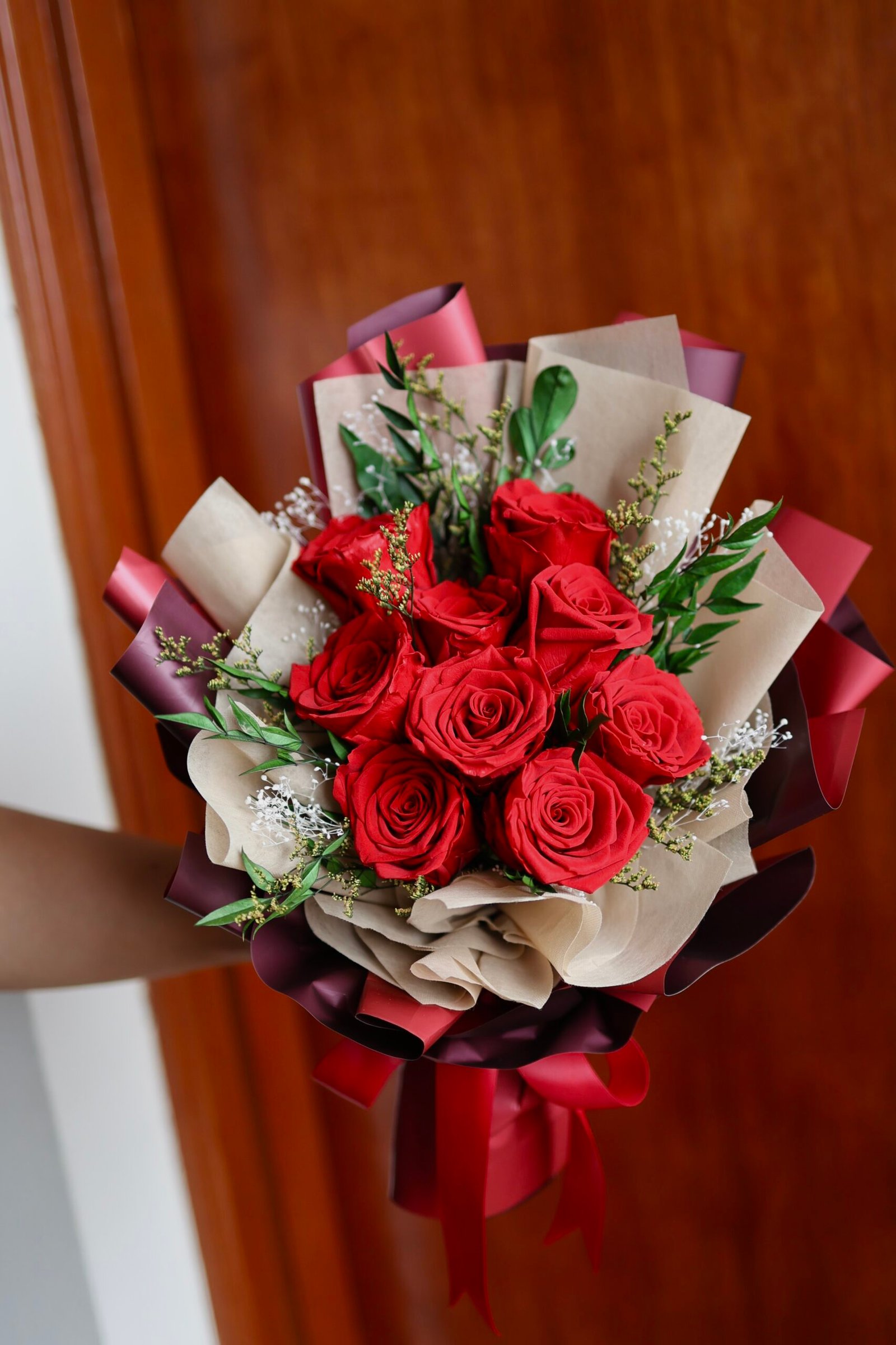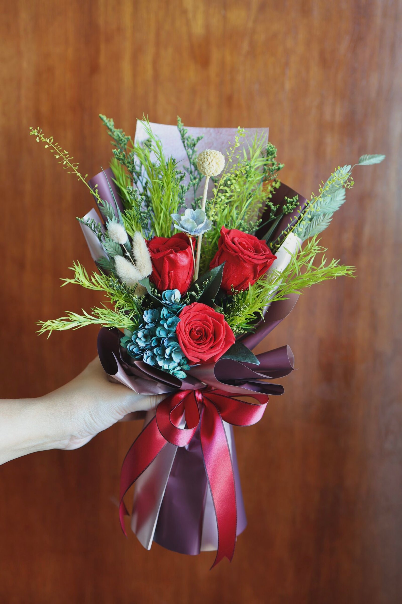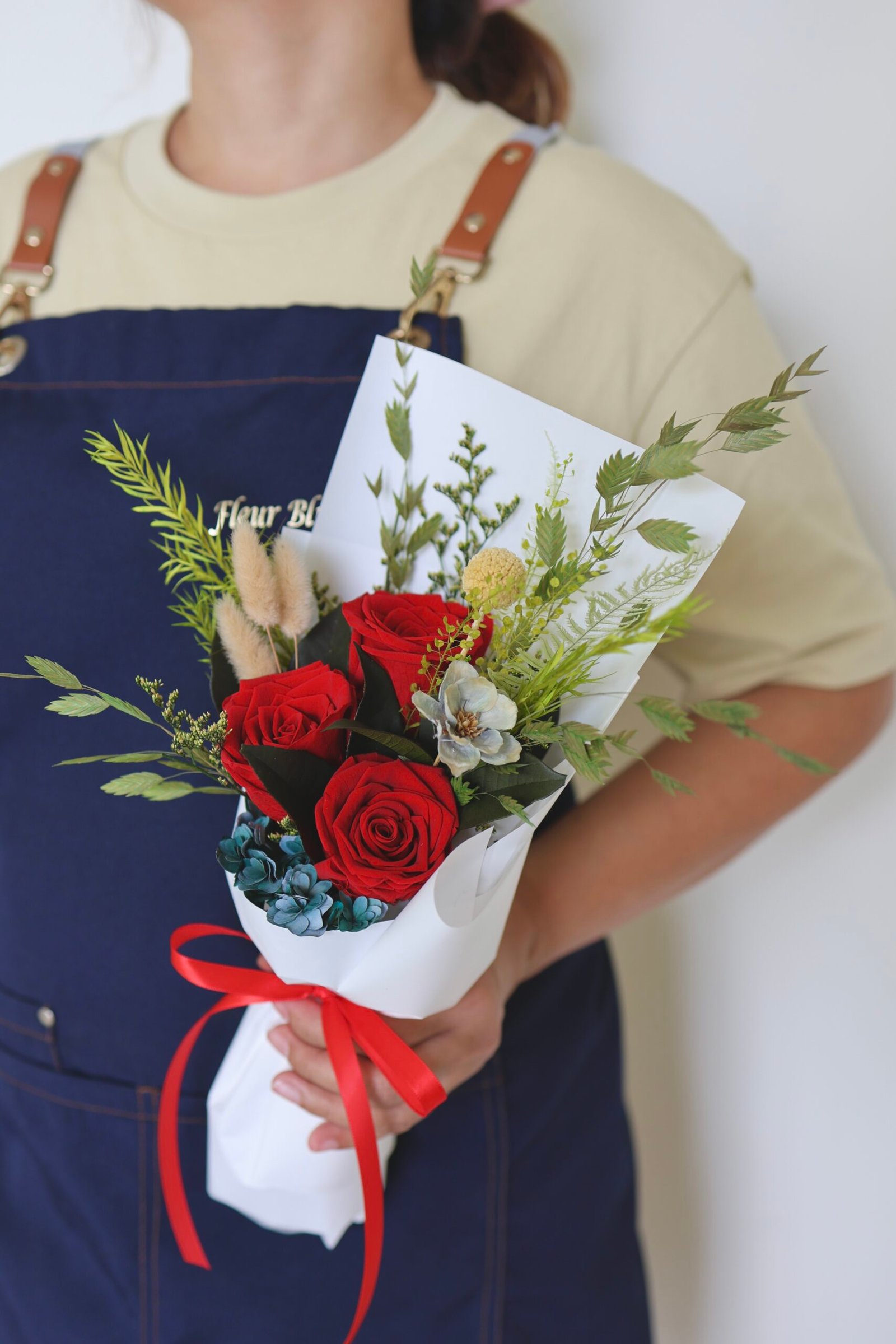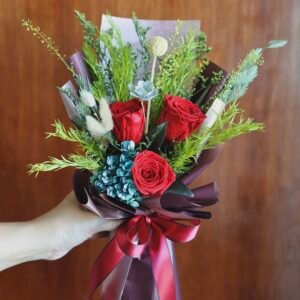 A stunning Valentine’s Day bouquet of *preserved red roses*. This arrangement, creating a timeless romantic look that lasts for years without watering. Ideal for gifting on Valentine’s Day, the preserved flowers offer a sophisticated, long-lasting alternative to fresh blooms, perfect for expressing love.